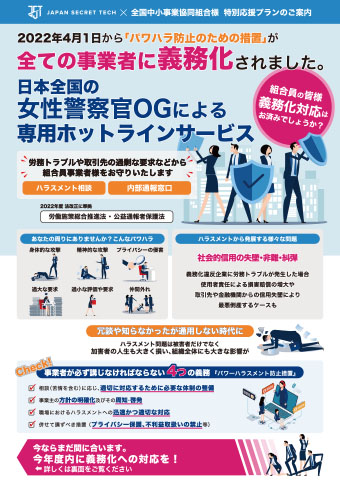2022年4月1日から「パワハラ防止のための措置」が全ての事業者に義務化されました。 女性警察官OGによる専用ホットラインサービスを、特別価格で利用することができます。
